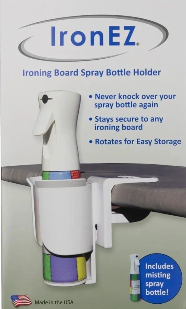 A revolutionary product that attaches to your ironing board to make ironing easy. It will solve the problem of repeatedly dropping your spray bottle while ironing, free up space on your ironing board, and make your life frustration free and more efficient.